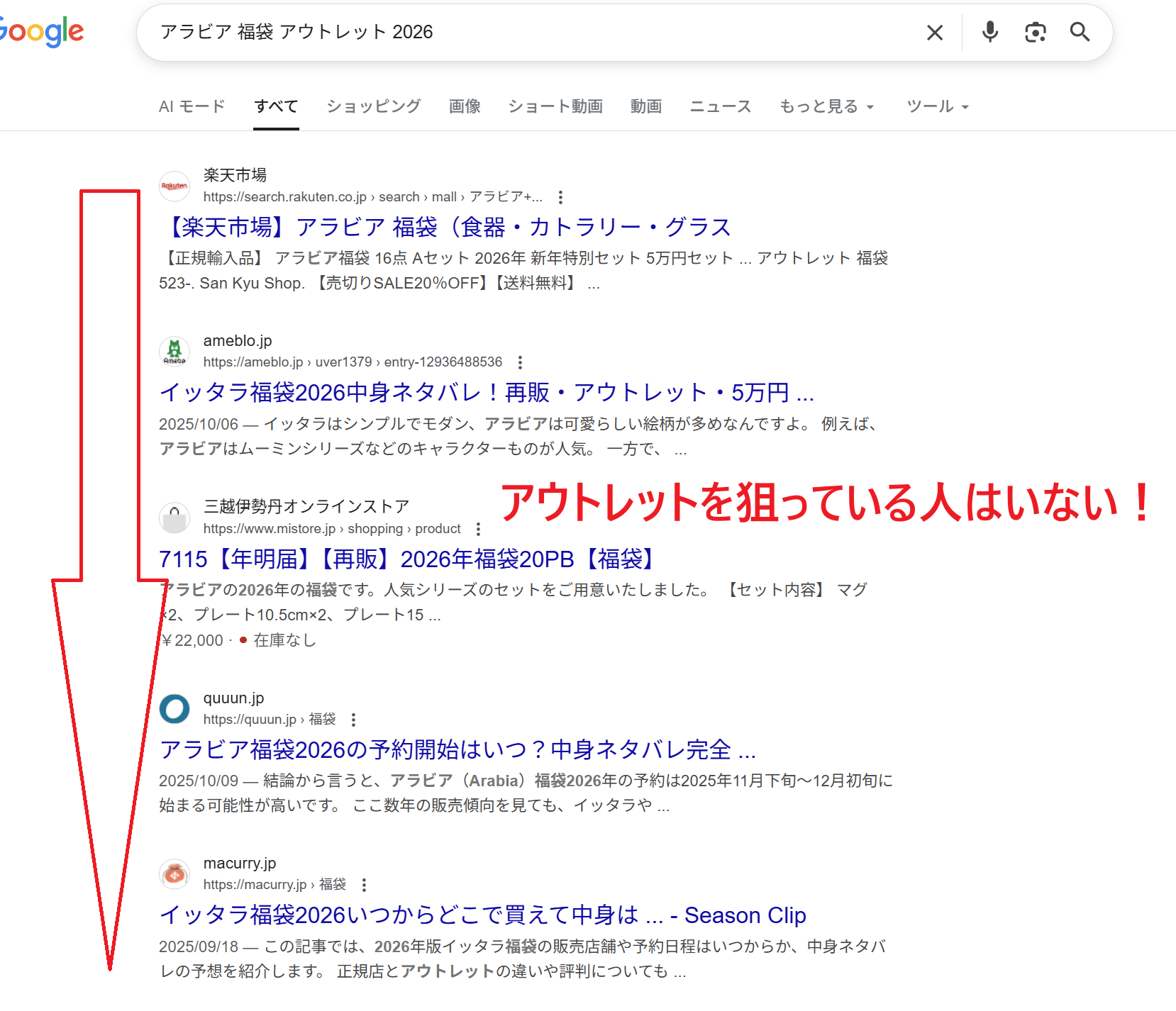 例えば「アラビア 福袋 アウトレット」というネタだとライバルが少ないですね。